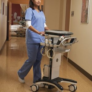 O carrinho recém-projetado foi criado para proteger o console durante o transporte. O carrinho também permite um ângulo de visualização muito melhor, com melhor ajuste em altura para realização de exames em pé ou em posição sentada.